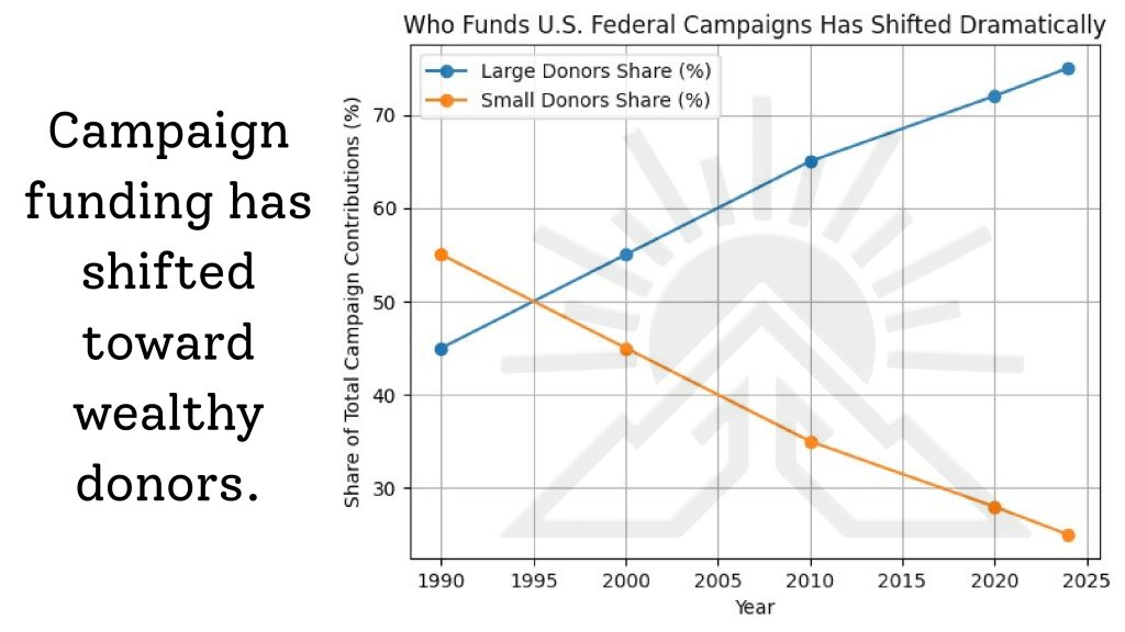 super PACs dominate messaging, and lobbying is pay to play. Public financing returns political